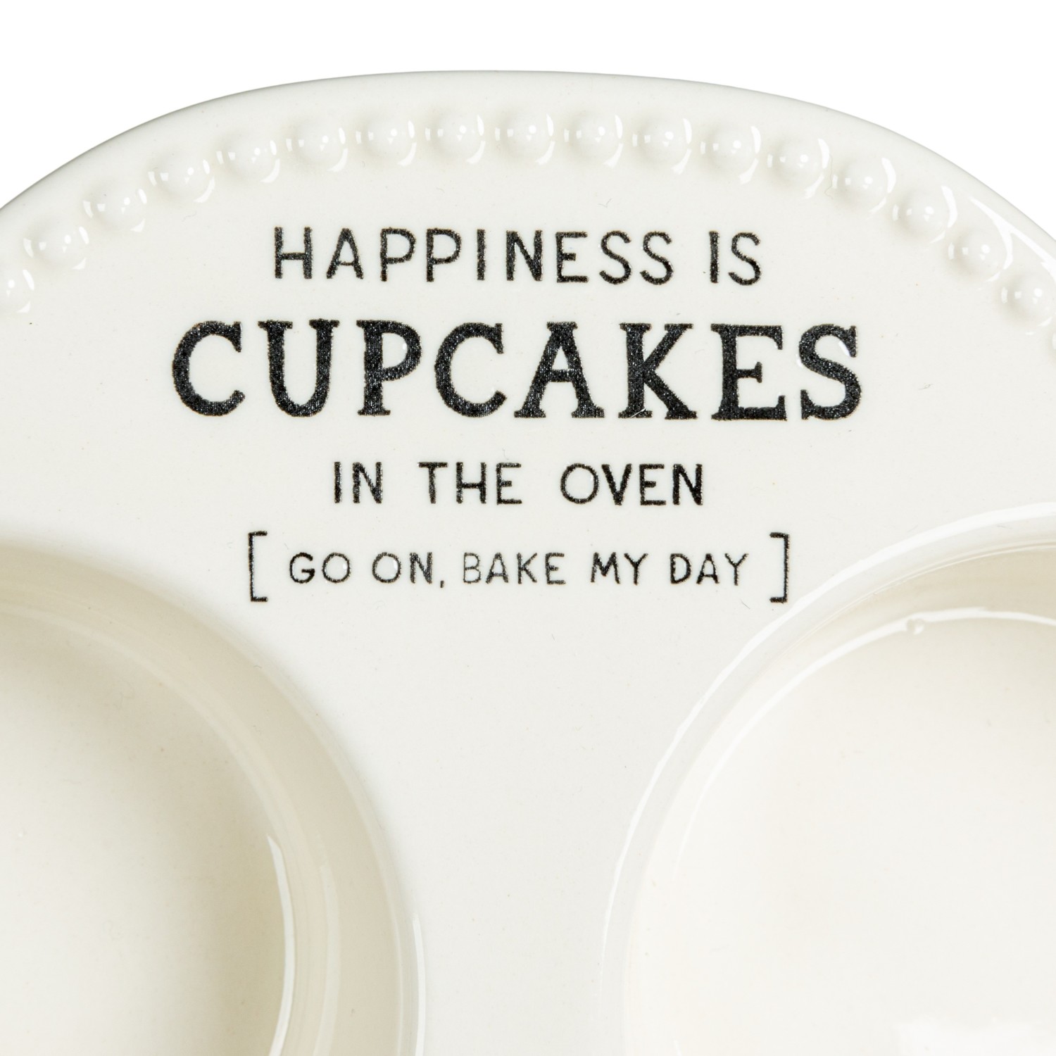 Catalog Name: 12"L x 7"W Stoneware Muffin Pan w/ Hobnail Edge & Wax Relief Saying "Happiness Is Cupcakes…", White & Black ©