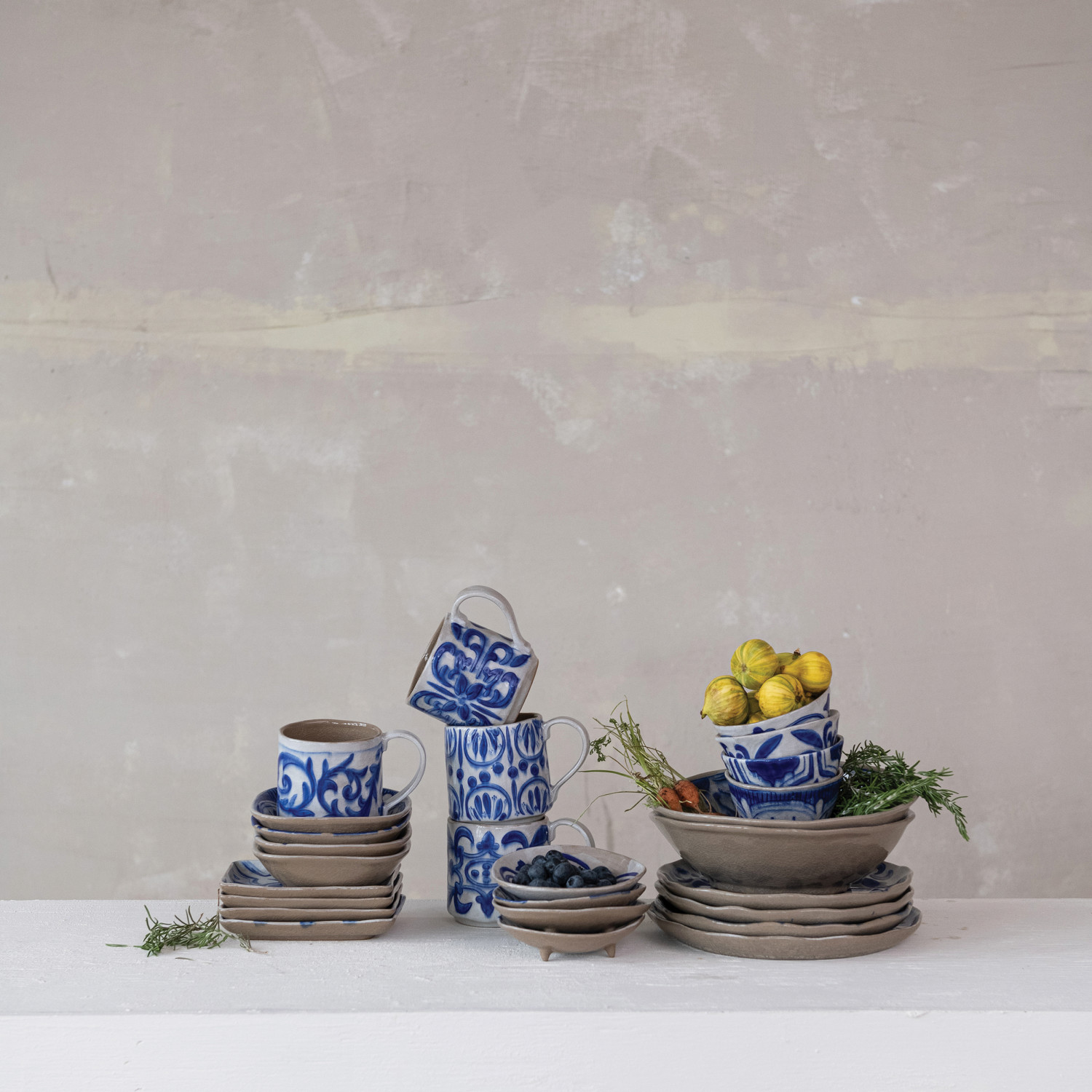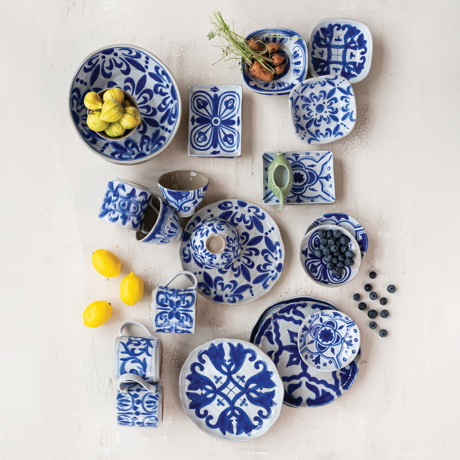 Catalog Name: 3-3/4" Round x 3-3/4"H 14 oz. Hand-Painted Stoneware Mug w/ Pattern, Crackle Glaze, Blue & White, 4 Styles (Each One Will Vary)