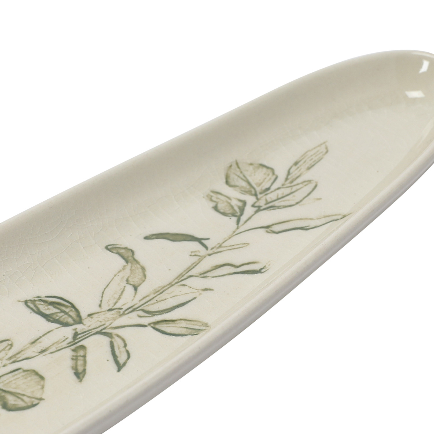 Catalog Name: 13-3/4"L x 2-3/4"W Oval Debossed Stoneware Tray w/ Botanical, Reactive Crackle Glaze, Cream Color & Green (Each One Will Vary) ©