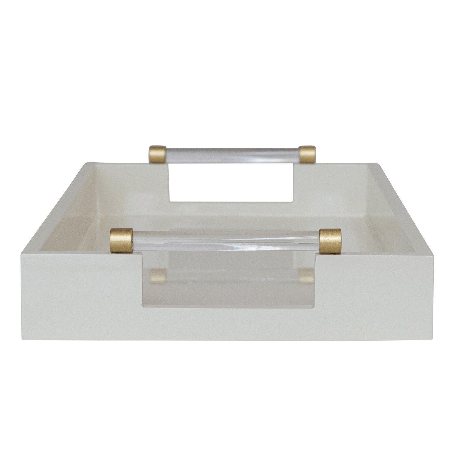Catalog Name: 20"L x 12"W MDF Lacquered Tray w/ Acrylic & Metal Handles, Cream Color & Gold Finish