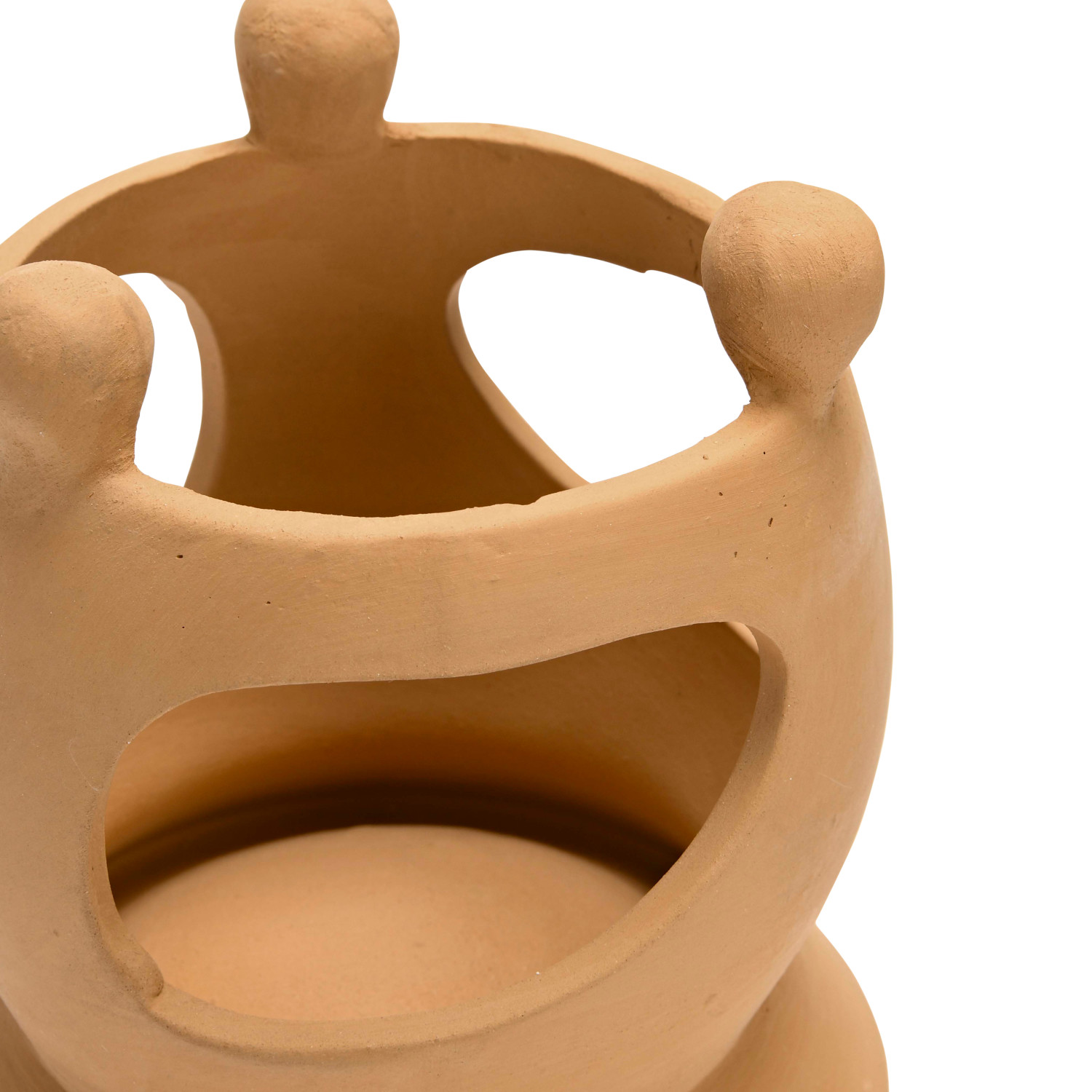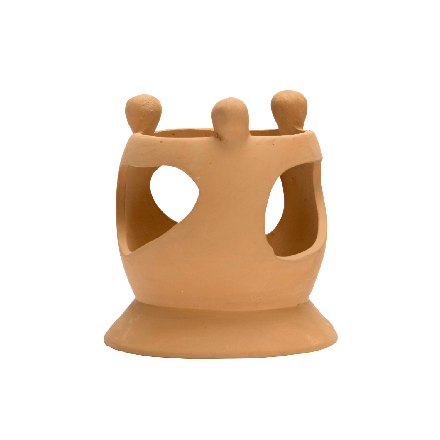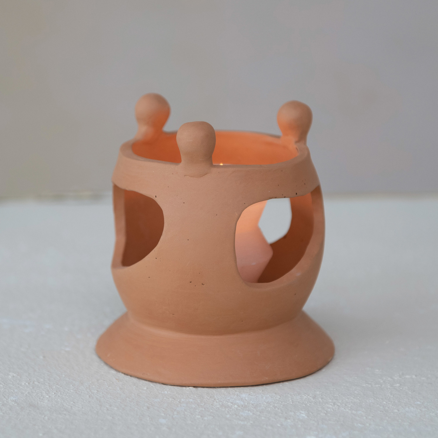 This handmade terracotta candle holder showcases an organic silhouette with cutout figure designs.