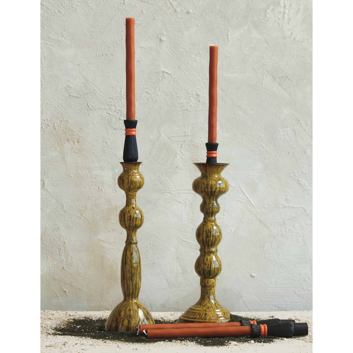 Unscented Witch Broom Shaped Taper Candles in Box, Orange Color & Black, Set of 2