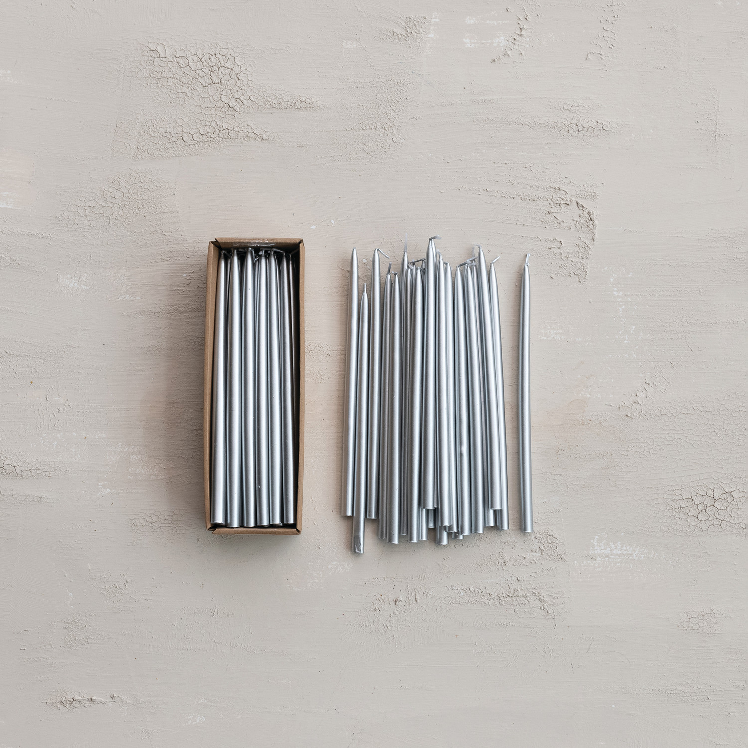 Catalog Name: Approx. 1/2" Round x 10"H Unscented Thin Taper Candles in Box, Silver Color, Set of 24 (Est. Burn Time 3-1/2 Hours)