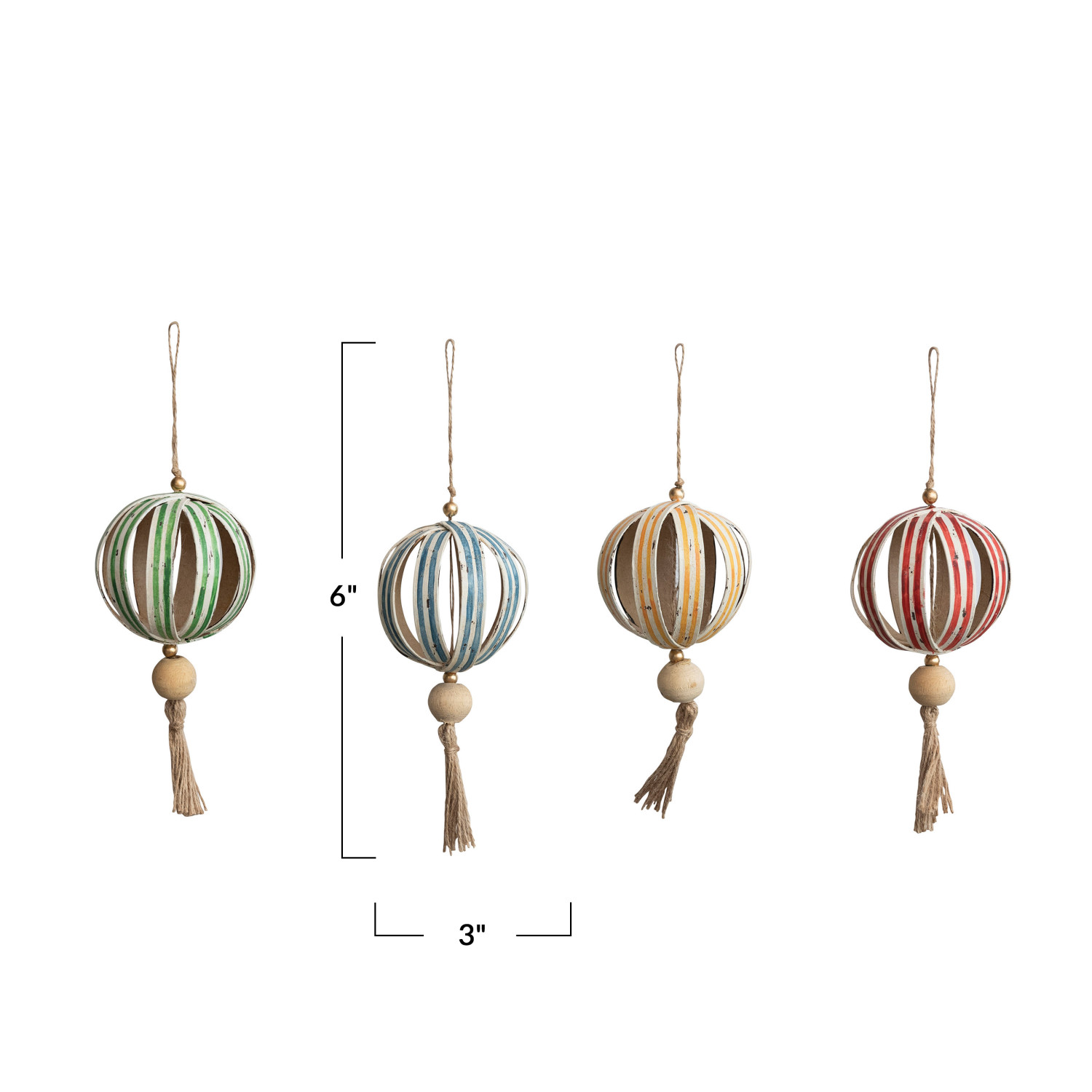 Catalog Name: 3" Round x 6"H Round Paper Ball Ornament w/ Wood Bead & Tassel, 4 Colors