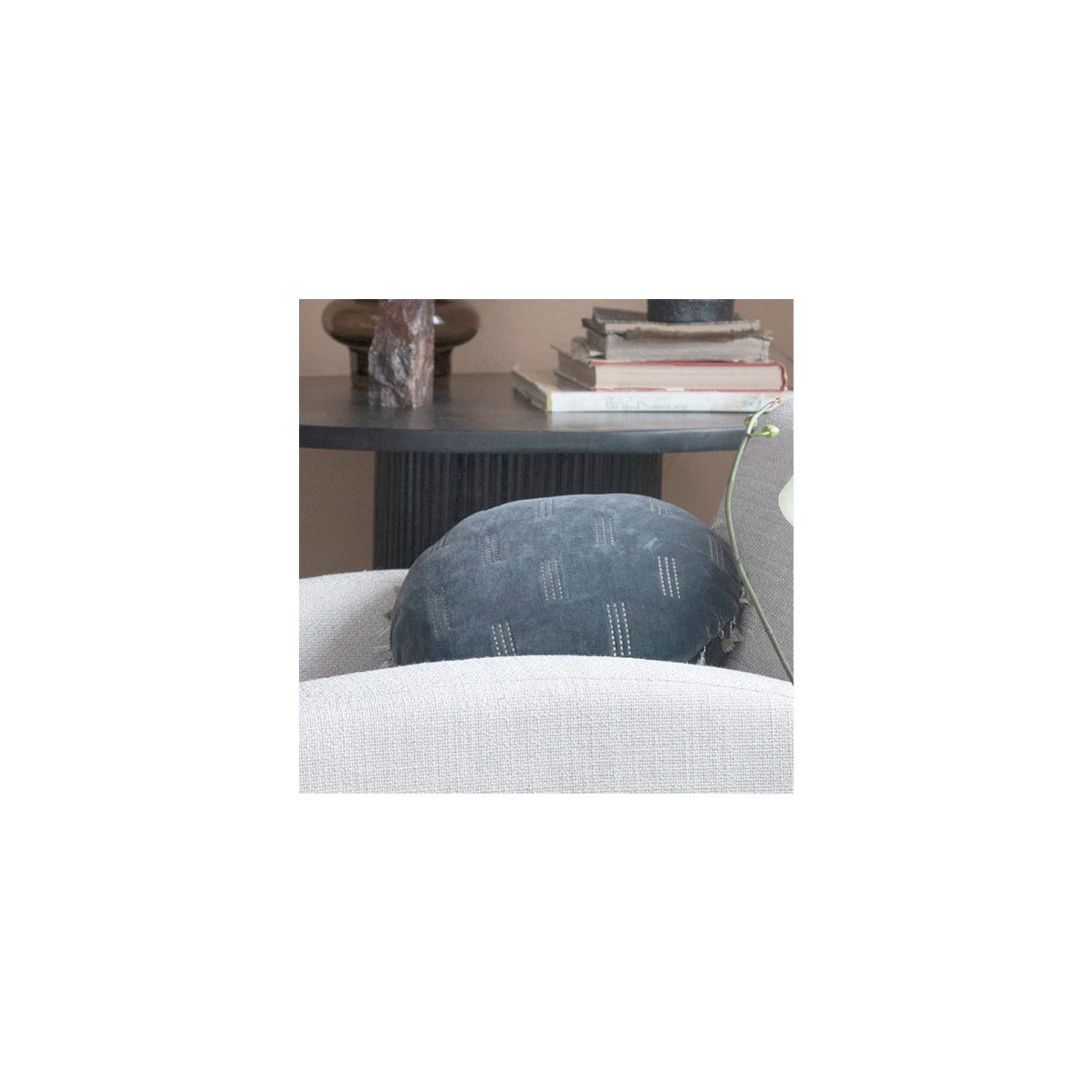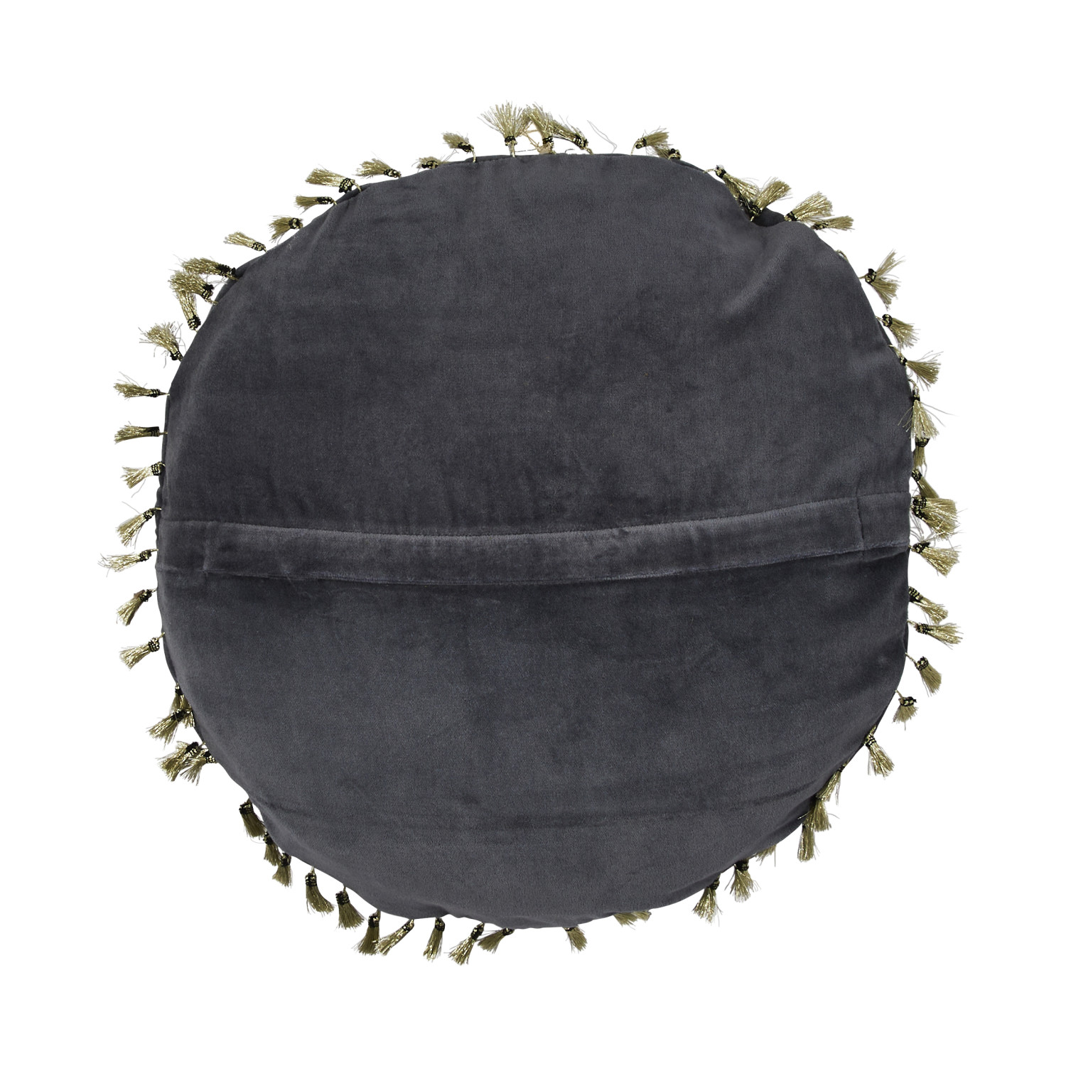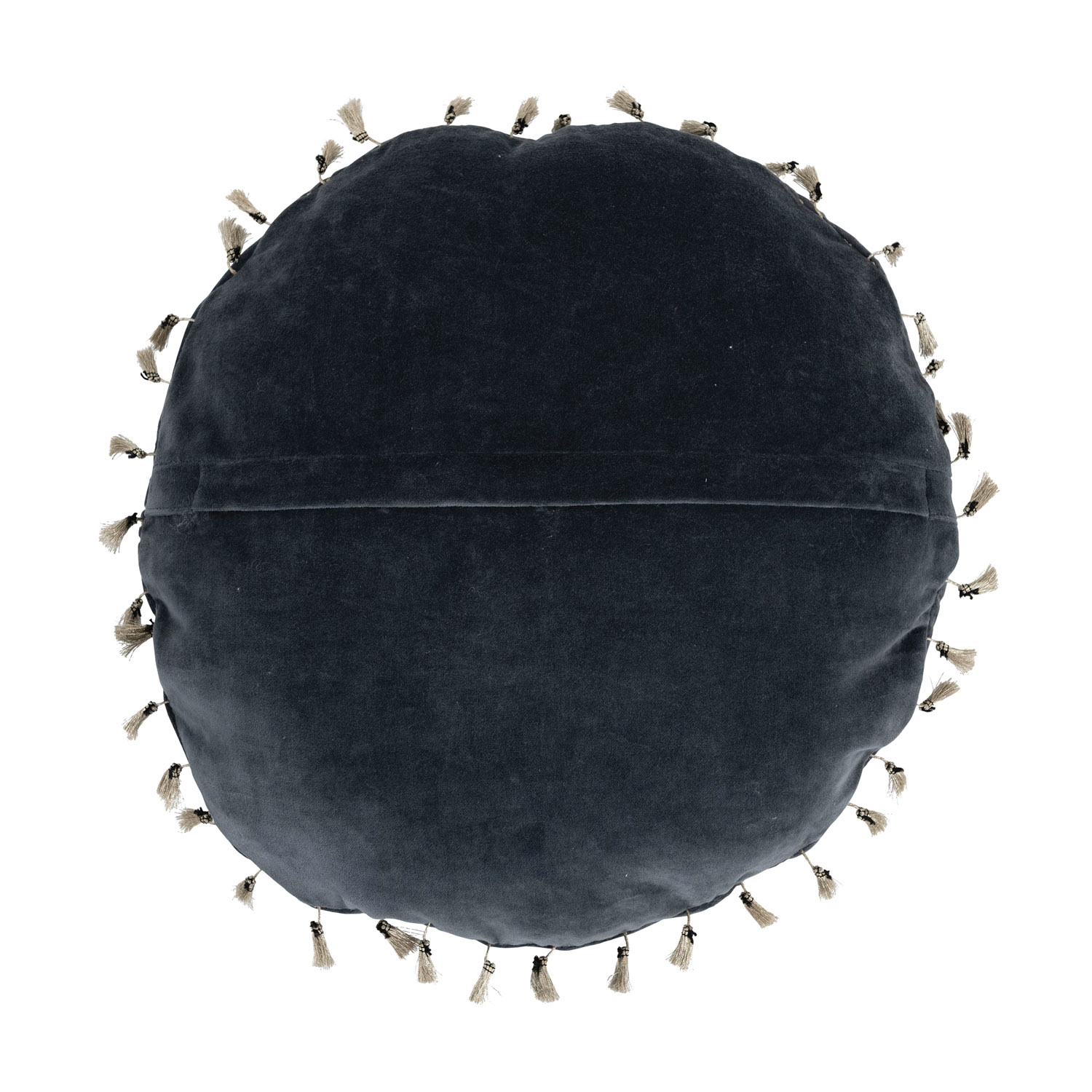 This glamorous throw pillow showcases modern metallic embroidery on luxurious cotton velvet, finished with decorative tassels. Round blue and gold cotton velvet throw pillow with metallic embroidery and tassels; Tonal cotton velvet encasement on back. Express your constantly evolving style with the simple addition of this eye-catching pillow. Removable throw pillow cover and insert; Back zipper with hidden flap; Hand wash cold, do not bleach, warm iron if needed.
