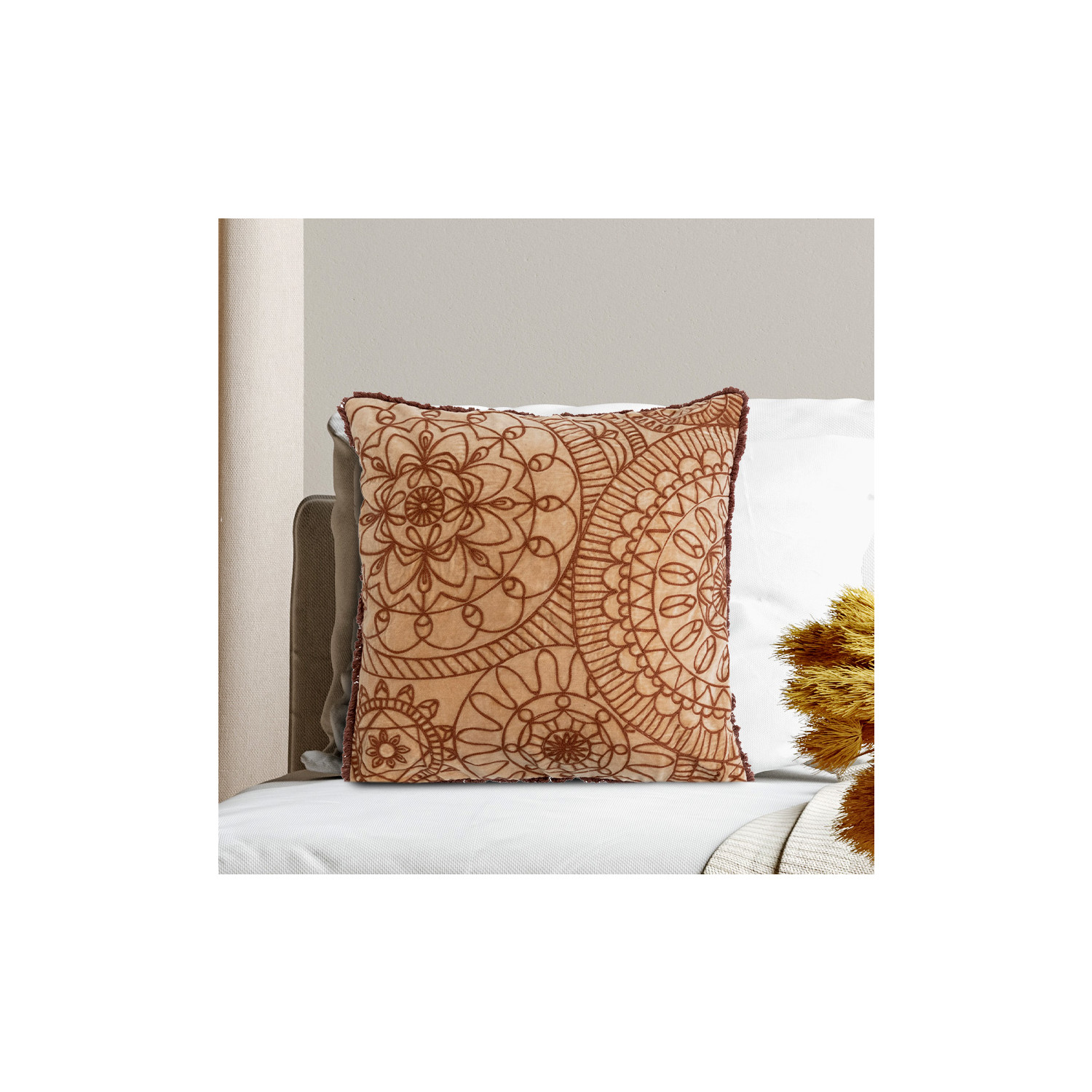 This striking throw pillow cover showcases luxurious, stonewashed cotton velvet construction with an intricately embroidered floral pattern, finished with delicate eyelash fringe. Multicolor cotton velvet throw pillow with embroidered floral pattern and eyelash fringe; Tonal chambray on back. Express your constantly evolving style with the simple addition of this eye-catching pillow. Removable throw pillow cover with polyester insert; Back zipper with hidden flap; Machine wash.