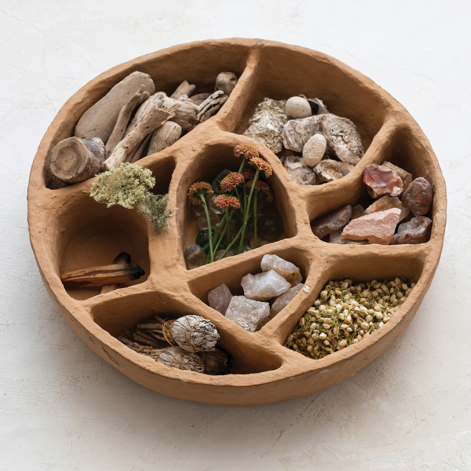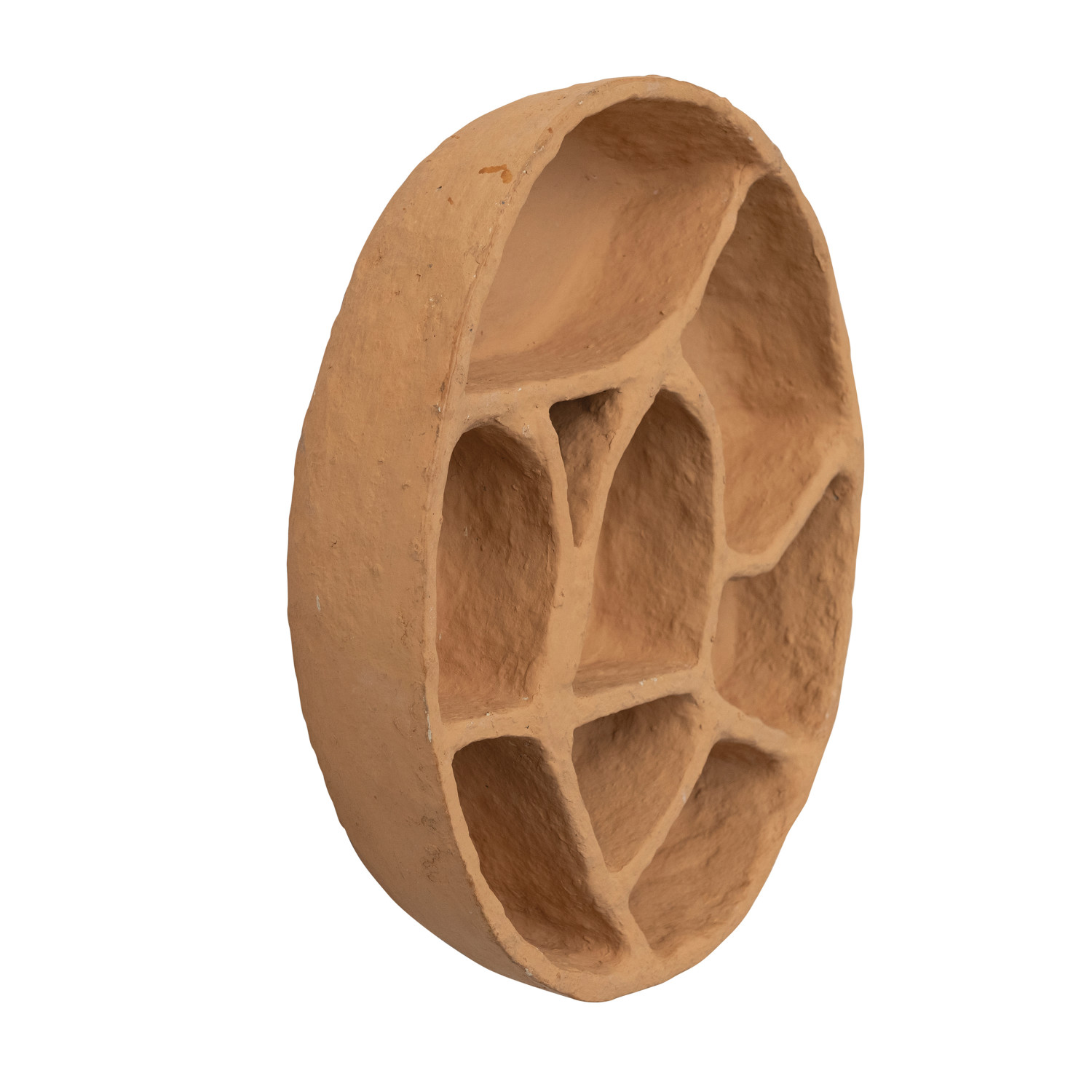 Catalog Name: 18" Round x 4"D Decorative Handmade Paper Mache Organic-Sectioned Shelf/Tray, Terra-cotta Color (Hangs or Sits) (Each One Will Vary)